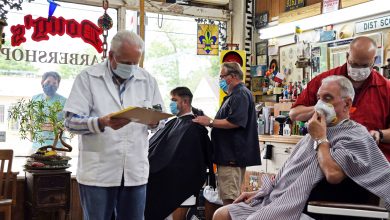 Men receive haircuts as social distancing guidelines to curb the spread of the coronavirus disease (COVID-19) are relaxed at Doug’s Barber Shop in Houston, Texas, May 8, 2020. Callaghan O’Hare…