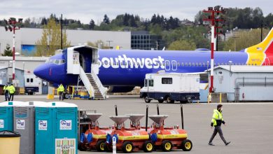 A worker wears a mask at the Boeing Renton Factory, where 737 MAX airliners are manufactured, as commercial airplane production resumes following a suspension of operations last month in response…