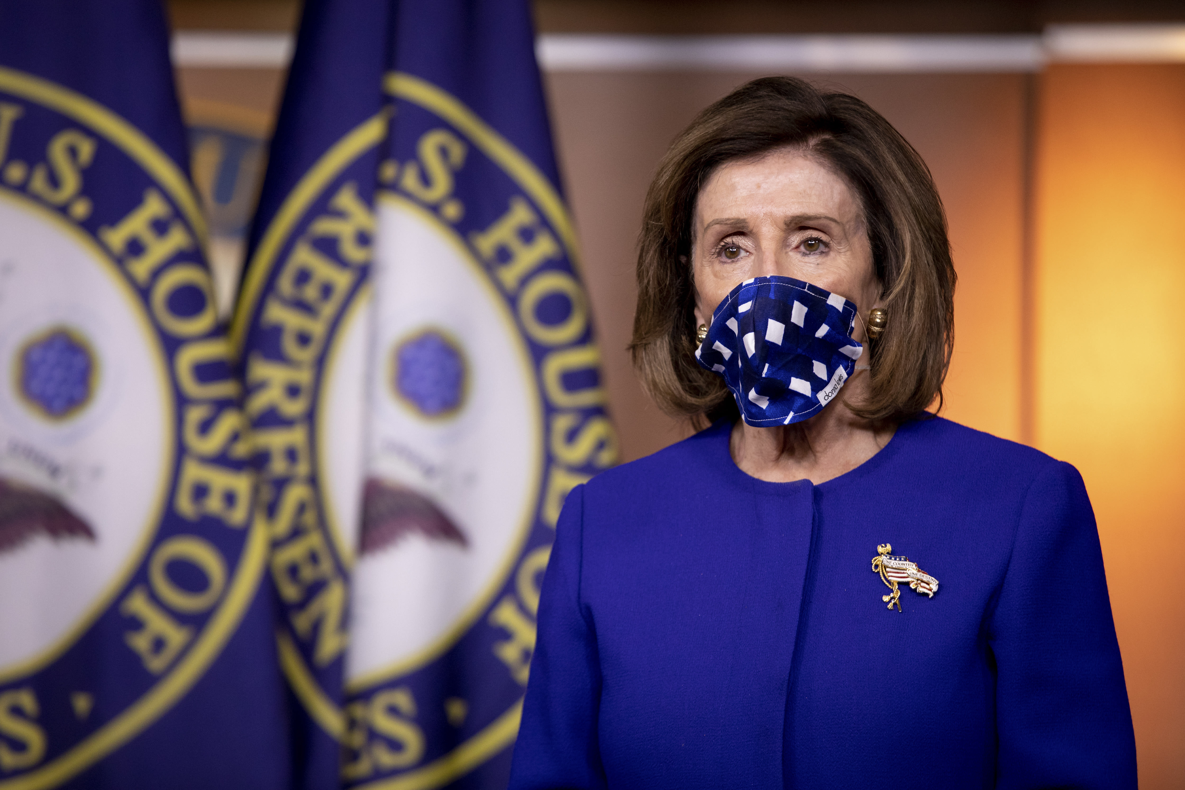 U.S. House Speaker Nancy Pelosi, a Democrat from California, wears a protective mask during a news conference in Washington, D.C., U.S., on Wednesday, April 29, 2020.