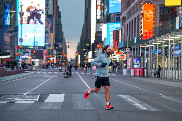 A man wearing a mask runs in an empty Times Square amid the coronavirus pandemic on May 9, 2020 in New York City. COVID-19 has spread to most countries around the world, claiming over 280,000 lives with over 4.1 million cases.